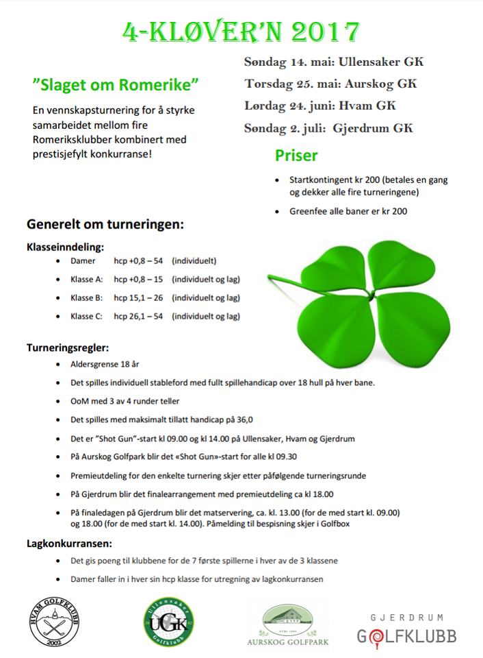 Søndag 14.5.17 arrangeres årets første 4-kløver turnering, på hjemmebane.4-kløver’n er en vennskapsturnering mellom UGK, Aurskog GK, Hvam GK og Gjerdrum GK. Tidlig start kl. 9.00 og sen start kl. 14.00 Startkontigenten er kr 200 og denne dekker deltagelse i alle … Les mer